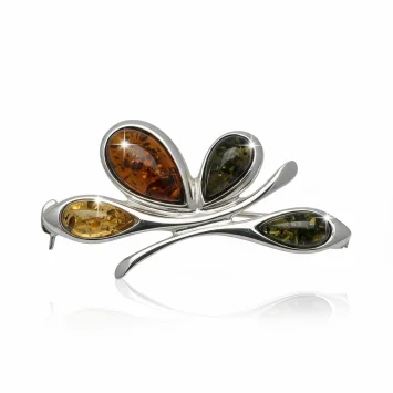 Elegancka srebrna broszka w kształcie stylizowanego motyla, zdobiona naturalnym bursztynem bałtyckim w odcieniach koniaku, zieleni i miodu. Wykonana z wysokiej jakości srebra próby 925. Idealny dodatek do marynarki, płaszcza lub szala, który doda blasku każdej stylizacji.
