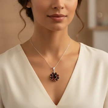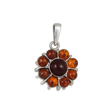 Bursztynowy blask w klasycznej odsłonie. Urocza srebrna zawieszka w kształcie kwiatu, skomponowana z dziewięciu naturalnych bursztynów bałtyckich. Ciemny, wiśniowy środek pięknie kontrastuje z wianuszkiem kamieni w odcieniu koniaku. Idealny dodatek, który rozświetli każdą stylizację i doda jej kobiecego wdzięku.