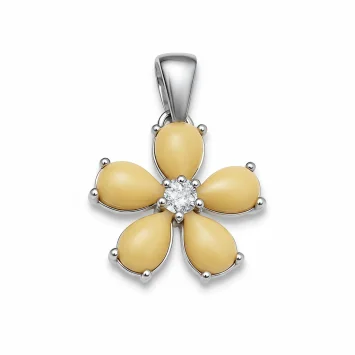 Największym atutem tej zawieszki jest wykorzystanie bursztynu mlecznego (zwanego też królewskim). Pięć kamieni w kształcie kropli tworzy płatki kwiatu. Ich nieprzejrzysta, kremowo-żółta barwa przypomina kość słoniową lub miód lipowy. Jest to rzadsza i bardzo ceniona odmiana bursztynu, która wspaniale prezentuje się na opalonej skórze oraz w towarzystwie jasnych ubrań.