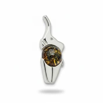 Podaruj odrobinę szczęścia. Wyjątkowa srebrna zawieszka w kształcie słonia z trąbą uniesioną do góry – symbolem pomyślności i sukcesu. Brzuszek słonika wypełnia naturalny bursztyn bałtycki w intrygującym, zielonym odcieniu, pełen lśniących inkluzji. Idealny prezent dla miłośników zwierząt i osób potrzebujących dobrej energii.