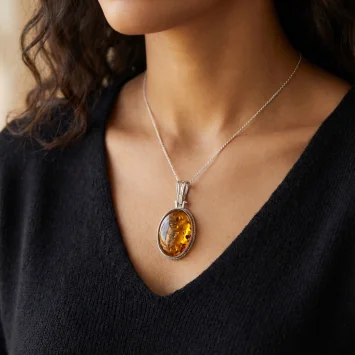 Biżuteria z bursztynem od wieków zachwyca swoją naturalną energią i niepowtarzalnym charakterem. Prezentowana zawieszka to hołd dla tradycyjnego jubilerstwa, łączący w sobie surowe piękno "Złota Północy" z kunsztownie wykonaną oprawą ze srebra. Głównym elementem kompozycji jest duży, owalny bursztyn bałtycki o głębokiej, nasyconej barwie koniakowej. Ten szlachetny kamień organiczny to zastygła przed milionami lat żywica, która w swoim wnętrzu skrywa historię dawnych lasów bursztynowych.