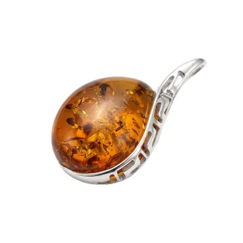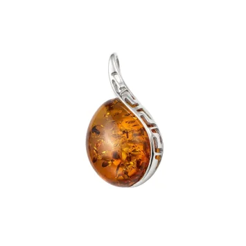 Elegancka zawieszka srebrna próby 925 z bursztynem bałtyckim w ciepłym koniakowym odcieniu. Ażurowa oprawa podkreśla wyjątkowy charakter kamienia i nadaje biżuterii delikatny, nowoczesny wygląd. Zawieszka ma kształt kropli (łezki) – delikatnie wydłużony, zaokrąglony od dołu i zwężający się ku górze. To klasyczny, elegancki kształt bardzo często stosowany w biżuterii z bursztynem, ponieważ podkreśla naturalne światło i głębię kamienia.
